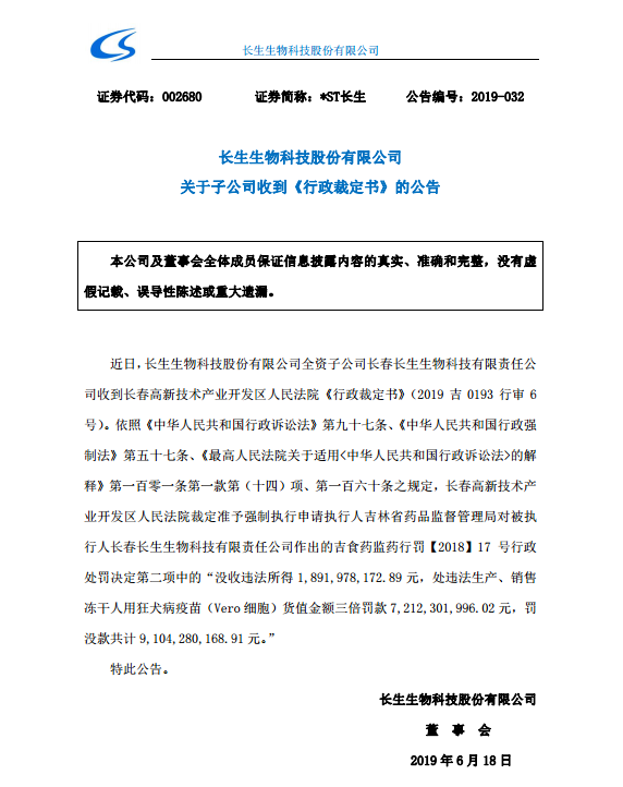 6月17日晚間,*ST長生公告稱,全資子公司長春長生生物科技有限責(zé)任公司收到長春高新技術(shù)產(chǎn)業(yè)開發(fā)區(qū)人民法院《行政裁定書》。深交所近日也作出公告披露。
