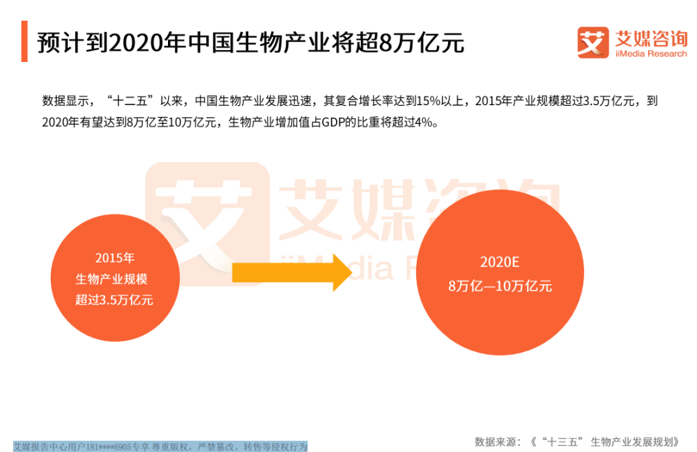iiMedia Research(艾媒咨詢)數(shù)據(jù)顯示,中國生物產(chǎn)業(yè)發(fā)展迅速,到2020年有望超8萬億元,生物產(chǎn)業(yè)增加值占GDP的比重將超過4%。